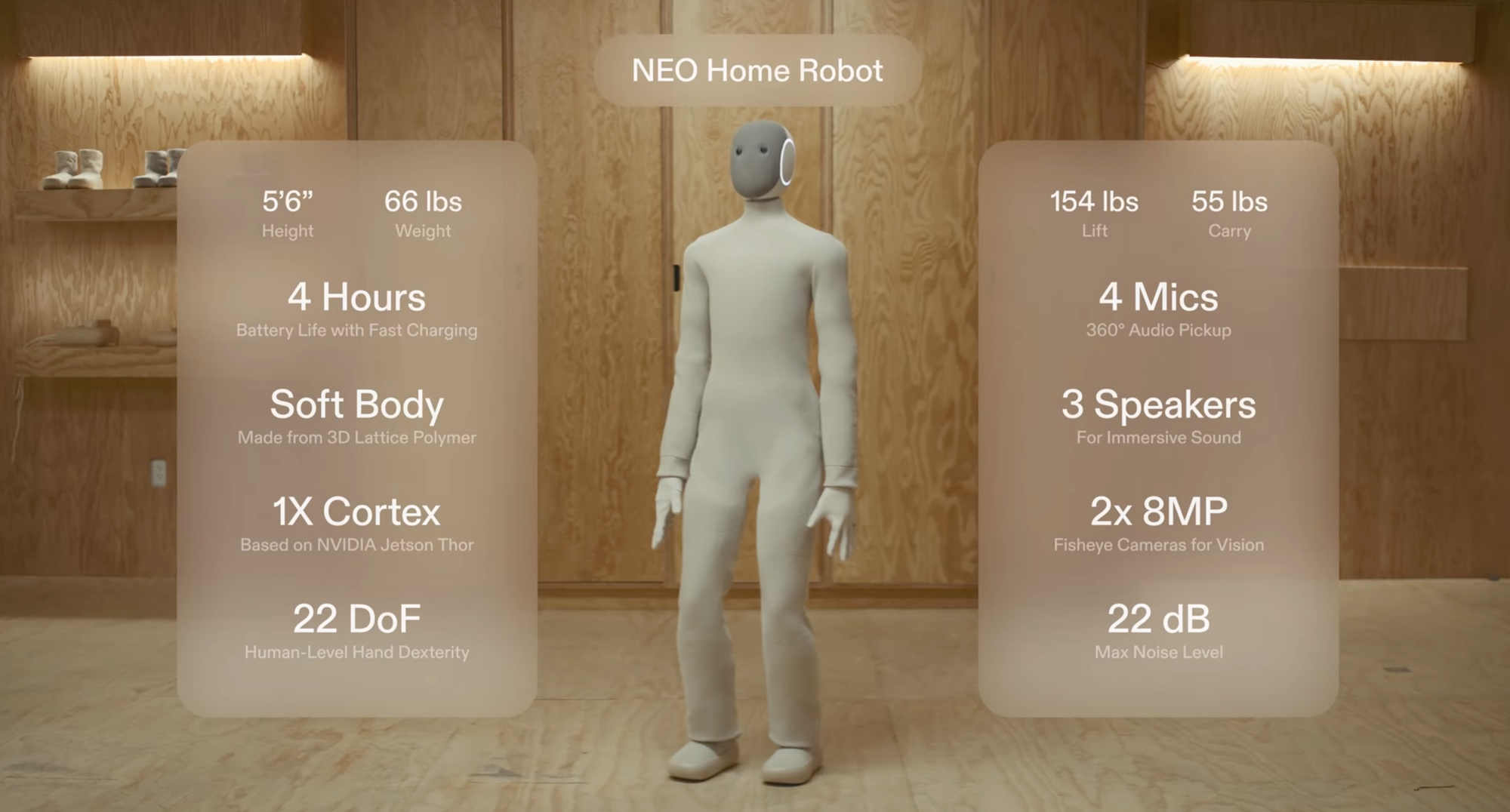 - NEO is a 5’6” soft-bodied humanoid that talks, tidies, climbs stairs, and takes commands by voice or app, built from the ground up for real homes, not research labs.
