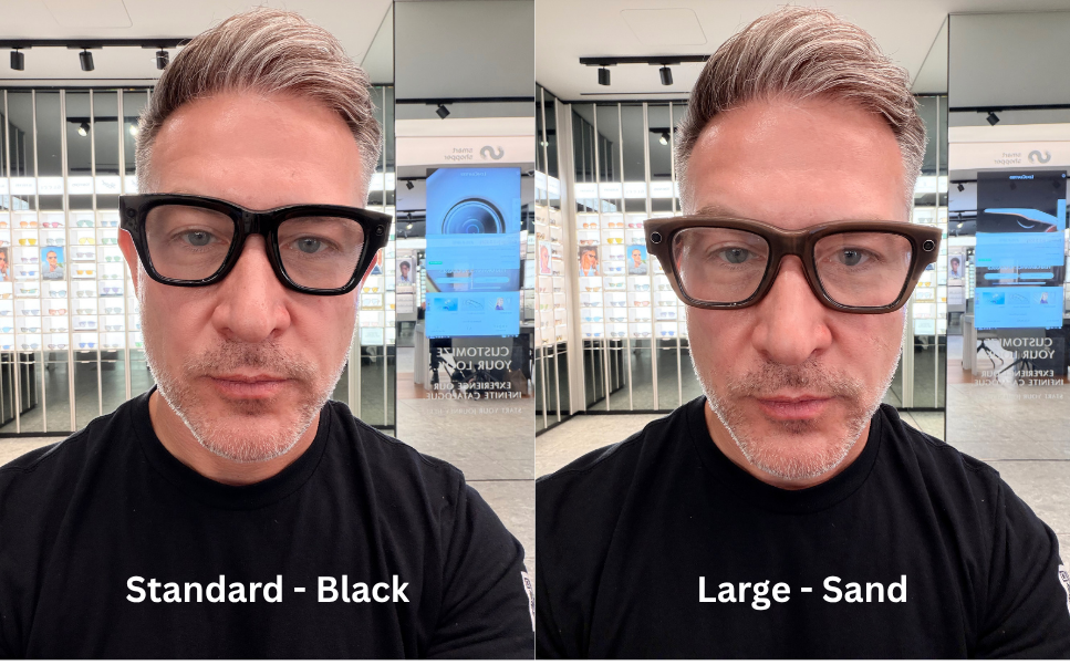 There are two sizes of frames: standard, which is 140mm, and large, which is 150mm, both measured hinge to hinge. I’ve always liked bold, oversized glasses and have been told I can pull them off, but I was still surprised by how big these felt, especially when compared to the Ray-Ban Meta frames. You can see in the picture below that even the standard size glasses cover my entire eyebrows. I imagine they could feel a bit overwhelming for anyone used to narrower or more traditional frames