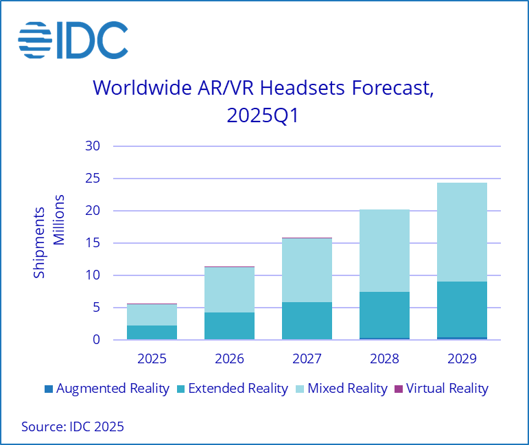 IDC forecasts strong growth in Mixed, Extended, and Augmented Reality, while shipments of pure VR headsets are expected to decline sharply. MR is projected to grow from 3.3 million units in 2025 to over 15.2 million by 2029, ER from 2.2 million to 8.6 million, and AR to 457,000 units. Despite a 12% decline in total shipments expected for 2025 due to delayed product launches, IDC projects a 87% rebound in 2026 and a compound annual growth rate of 38.6% through 2029, ultimately surpassing the pandemic-era peak.