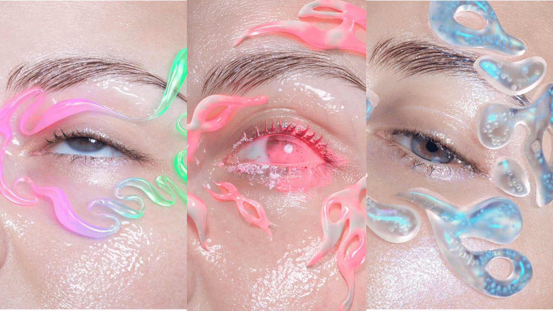 A model stares at the camera as an impossible liquid metal accessory drips and rolls across her forehead, framing her eyes with vibrating chrome dots. She is transformed by techno-organic “3D makeup” that decorates her face using 3D printed artifacts, computer-generated imagery (CGI), and augmented reality (AR) animations.